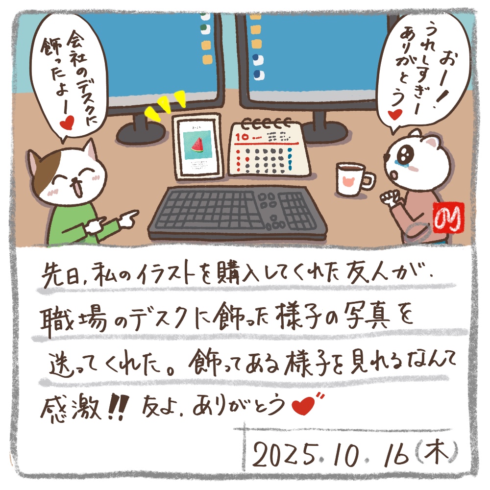 友人が、私のイラストを会社のデスクに飾ってくれて、その様子を写真で送ってくれた✨️
