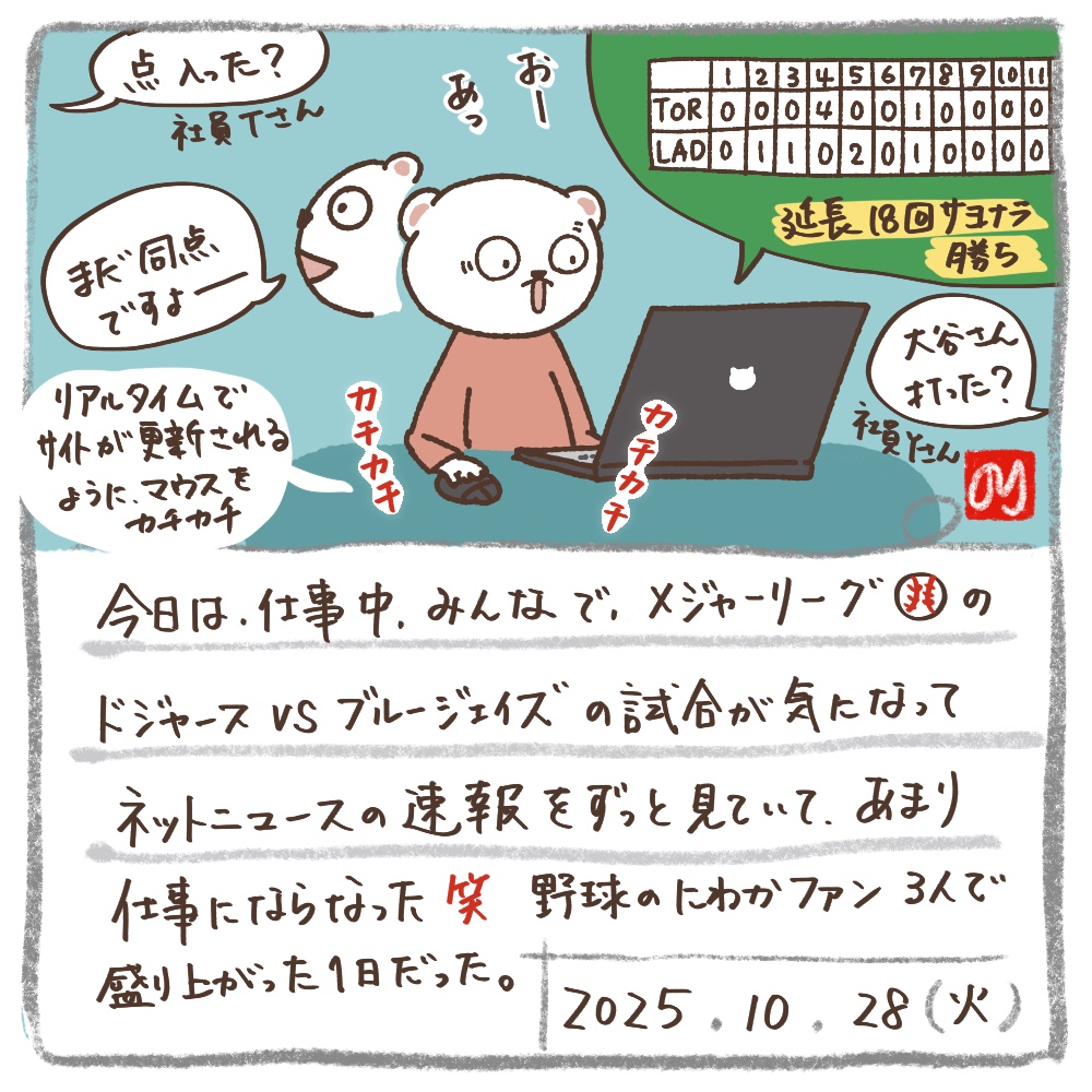 昼休みにみんなでテレビでワールドシリーズの情報を見たら、もう気になってしまい、