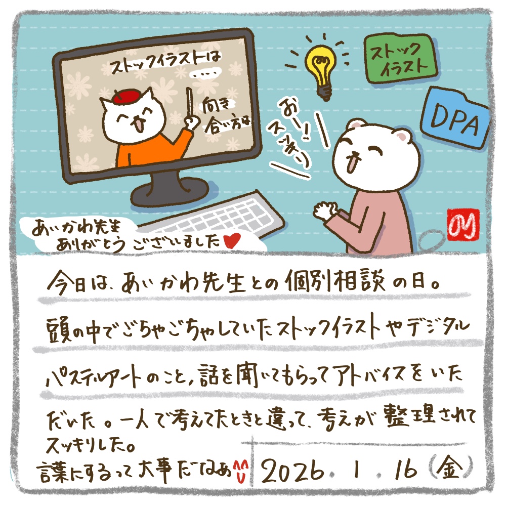 ストックイラストのこと、デジタルパステルアートのことなど話を聞いていただき、考えが整理された。