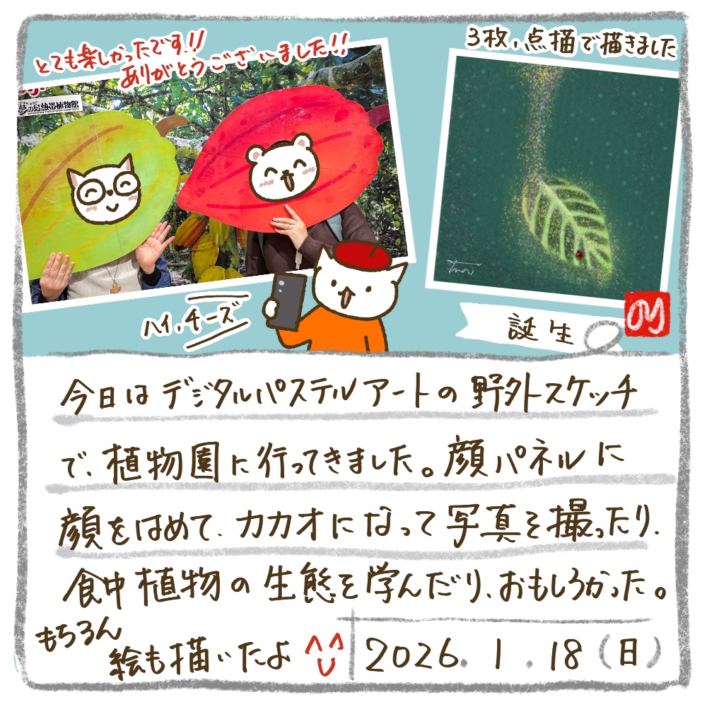 今日は、夢の島熱帯植物館でデジタルパステルアートの点描の野外スケッチ🎨