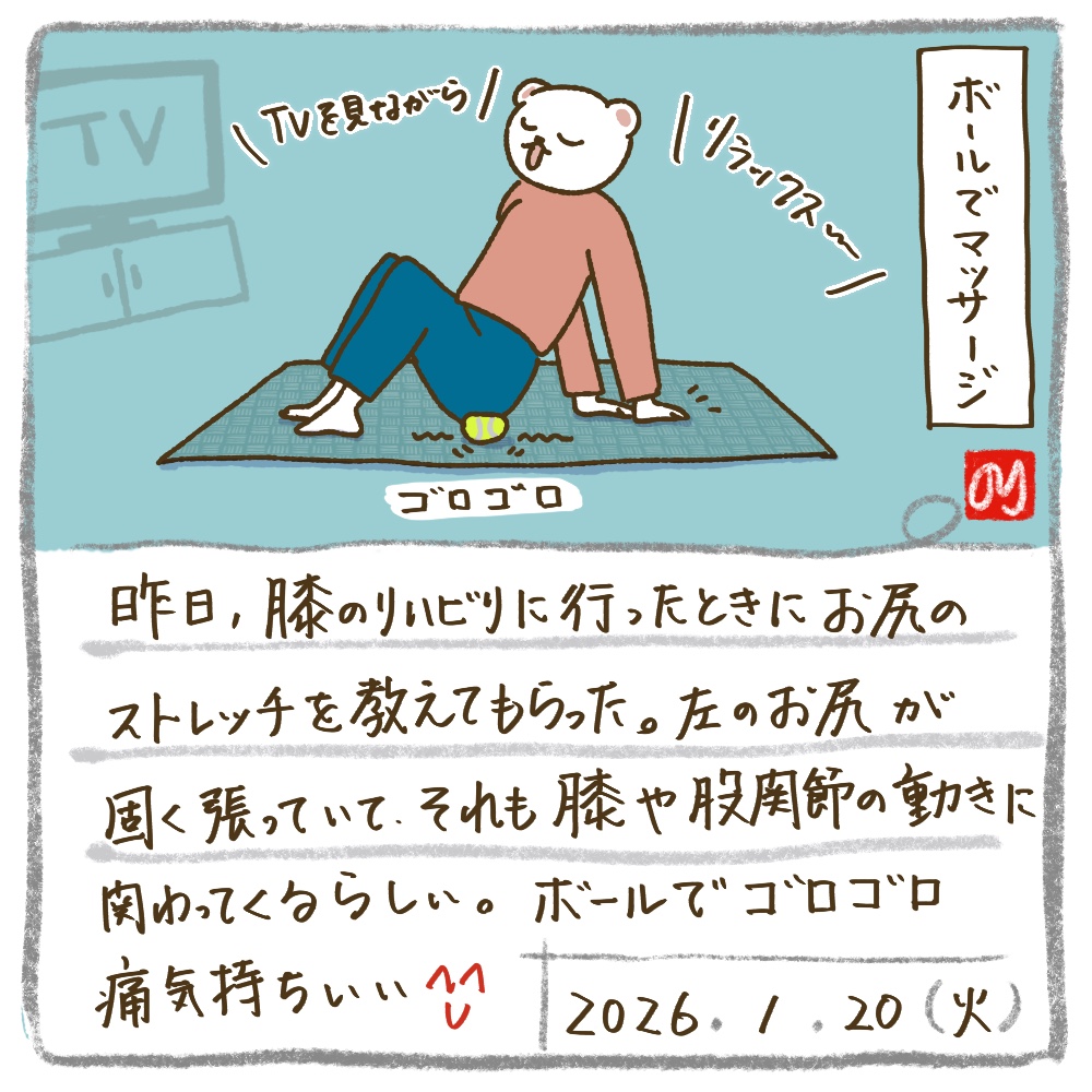100均で買ったストレッチ用のボールで、おしりをゴロゴロ。