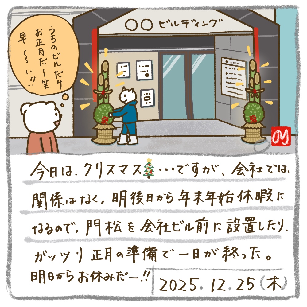 ビル1階のコンビニはクリスマスケーキの呼び込みしている横で、植木屋さんに門松を設置してもらいました😆